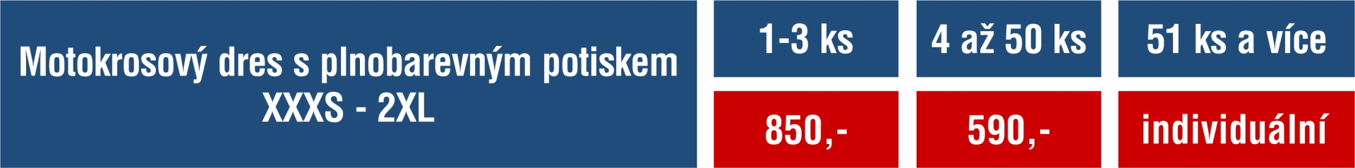 Dresy pro motokros navrhujeme a vyrábíme již od jednoho kusu. Grafické zpracování je zdarma a motokrosový dres může být vyrobený v různých typech střihu (kulaté sedlo atd.) Motokrosové dresy vyrábíme ve velikostech XXXS až 2XL a v případě požadavku i větší velikostech. Motokrosové dresy vyrábíme plnobarevné a proto nerozlišujeme počet log ani barev. Límec dresu je do "V" a při výrobě neůčtujeme přepisování jmen ani čísel. Pro samotnou realizaci motokrosového dresu nám stačí poslat logo klubu, náčrtek nebo obrázek a my vám připravíme grafický návrh.